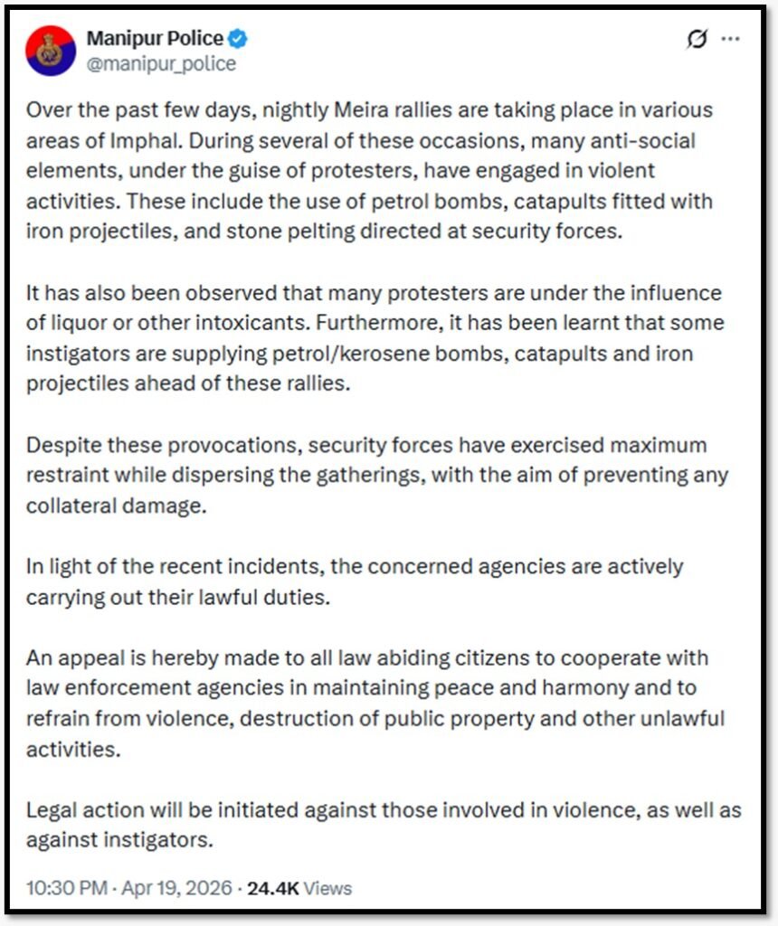 राज्य में 18 अप्रैल से पूर्ण बंद लागू है, जिसके कारण आम जनजीवन बुरी तरह प्रभावित हुआ है। बाजार बंद हैं, परिवहन सीमित है और लोग रोजमर्रा के कामों के लिए भी संघर्ष कर रहे हैं। ऐसे माहौल में हजारों महिलाओं का एक समूह, जिसे ‘मेइरा पाइबी’ कहा जाता है, सड़कों पर उतर आया है और शांति बहाल करने की कोशिश कर रहा है।