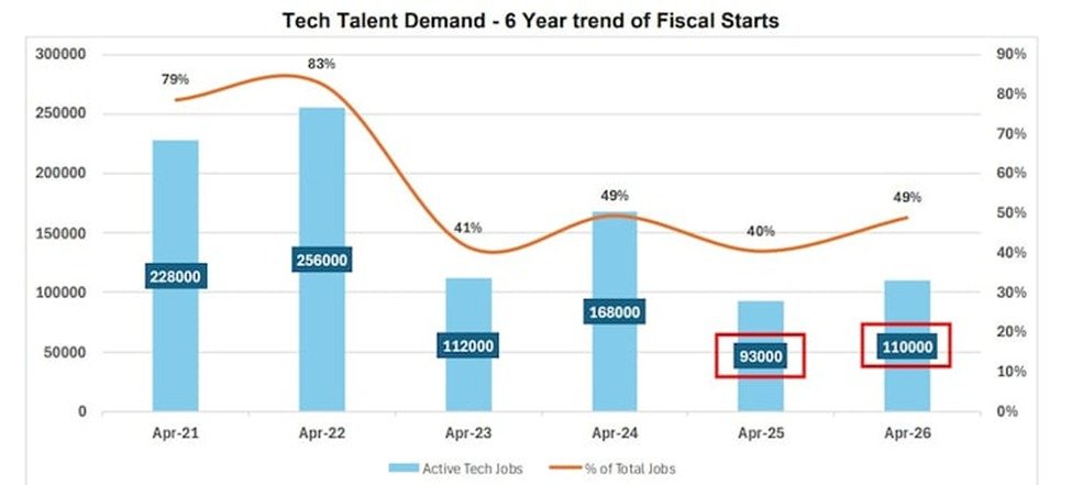 अप्रैल 2026 में कुल 1.10 लाख एक्टिव टेक जॉब ओपनिंग्स दर्ज की गईं, जो मार्च के मुकाबले 8% कम हैं। हालांकि, पिछले साल अप्रैल की तुलना में यह आंकड़ा 7% ज्यादा है, लेकिन गिरावट का यह संकेत चिंता बढ़ाने वाला है।