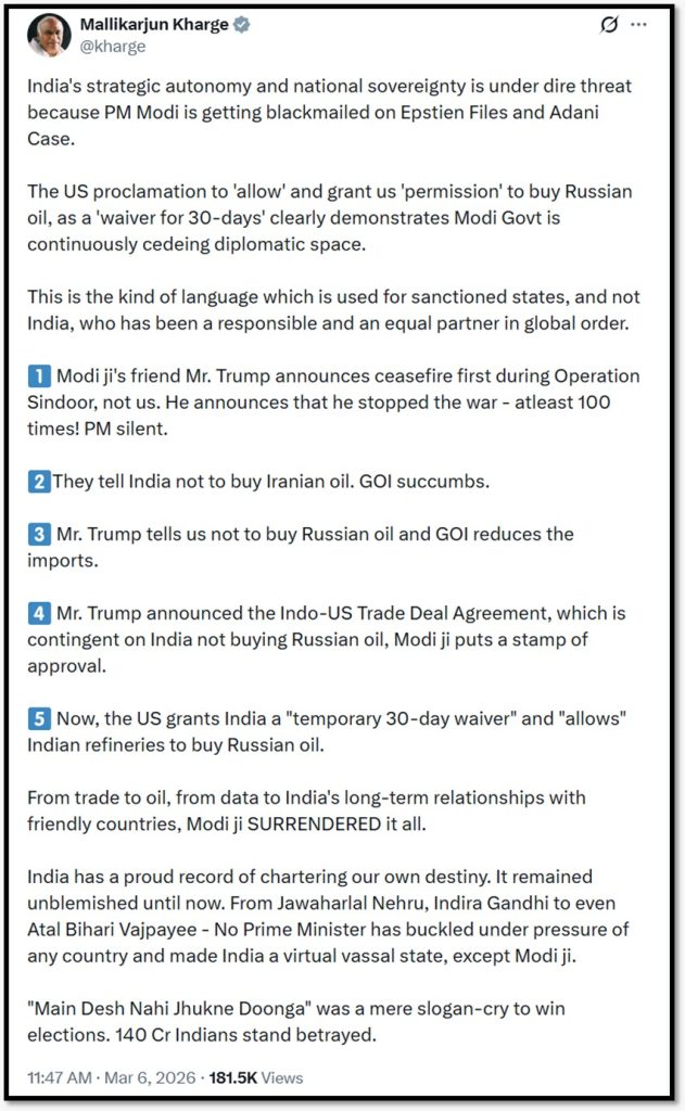 कांग्रेस अध्यक्ष मल्लिकार्जुन खड़गे ने भी इस मामले में सरकार की आलोचना की है। उन्होंने कहा कि भारत की रणनीतिक स्वतंत्रता पर दबाव बढ़ रहा है।