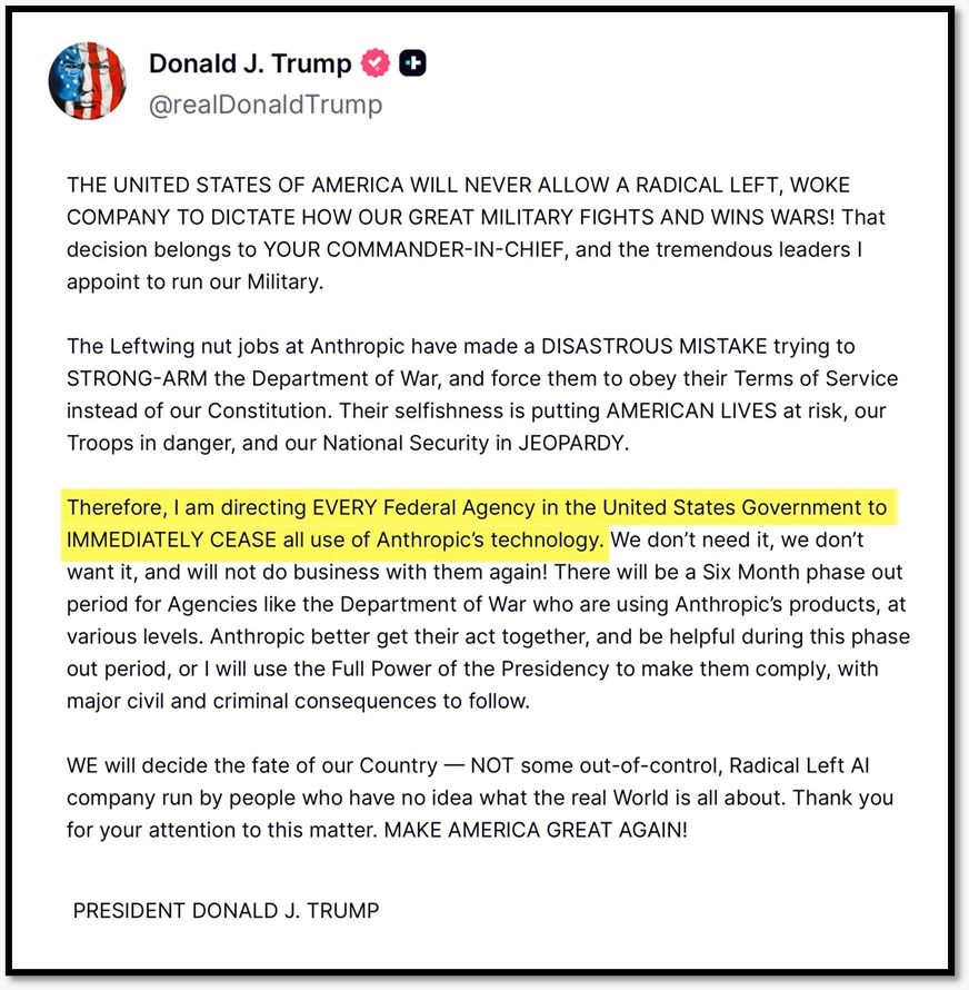 ट्रम्प ने एंथ्रोपिक को “वोक” और “कट्टरपंथी वामपंथी” कंपनी बताते हुए कहा कि अब सरकार उसका उपयोग नहीं करेगी। कंपनी को “सप्लाई-चेन रिस्क” भी घोषित किया गया, जो आमतौर पर विदेशी कंपनियों के लिए इस्तेमाल होता है। इसका मतलब है कि अमेरिकी सेना और उसके ठेकेदार अब एंथ्रोपिक के साथ काम नहीं कर पाएंगे।