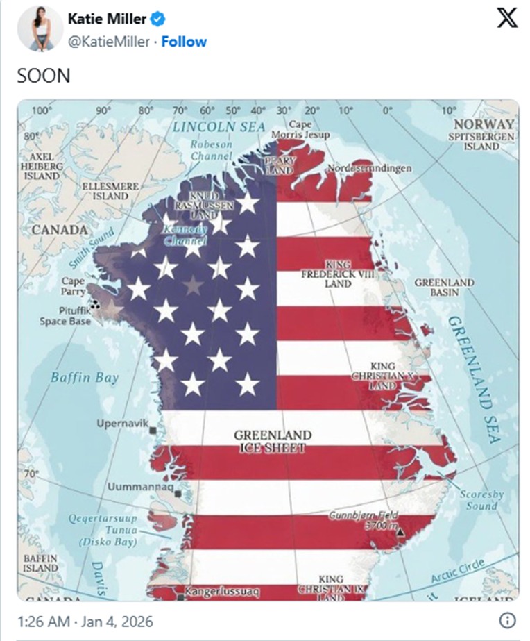 शनिवार देर रात, केटी मिलर – ट्रंप के डिप्टी चीफ ऑफ स्टाफ स्टीफन मिलर की पत्नी – ने अपने X फीड पर डेनिश स्वायत्त क्षेत्र की विवादास्पद तस्वीर अमेरिकी झंडे के रंगों में पोस्ट की। उनकी पोस्ट के ऊपर एक ही शब्द था: “जल्द ही”।