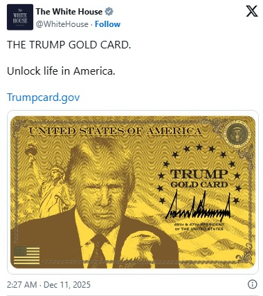 ट्रंप ने ट्रुथ सोशल पर एक पोस्ट में कहा, “संयुक्त राज्य सरकार का ट्रंप गोल्ड कार्ड आज यहां है! सभी योग्य और सत्यापित लोगों के लिए नागरिकता का सीधा मार्ग। कितना रोमांचक! हमारी महान अमेरिकी कंपनियां आखिरकार अपनी अमूल्य प्रतिभा को रख सकती हैं।”