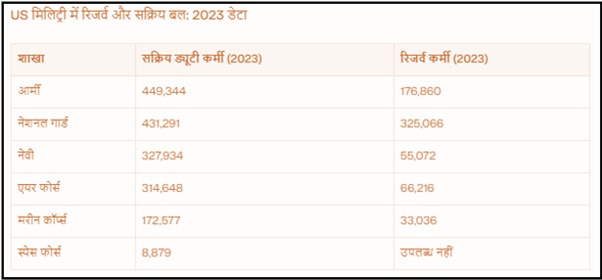 शाखाएँ: आर्मी नेशनल गार्ड और एयर नेशनल गार्ड, जिनमें लगभग 431,000 सदस्य हैं। यह अमेरिकी सेना की दूसरी सबसे बड़ी शाखा है।