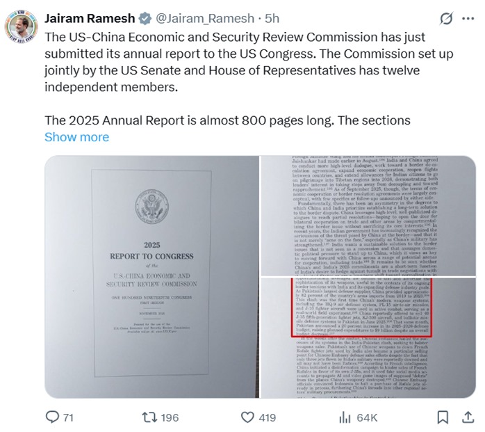 USCC की रिपोर्ट दिखाती है कि मई 2025 का भारत–पाकिस्तान संघर्ष चीन के लिए एक रणनीतिक अवसर बन गया। चीन ने दुष्प्रचार के जरिए अपने J-35 को बढ़ावा दिया और इस पूरे घटनाक्रम को हथियार बाज़ार में अपनी पकड़ मजबूत करने के लिए इस्तेमाल किया।