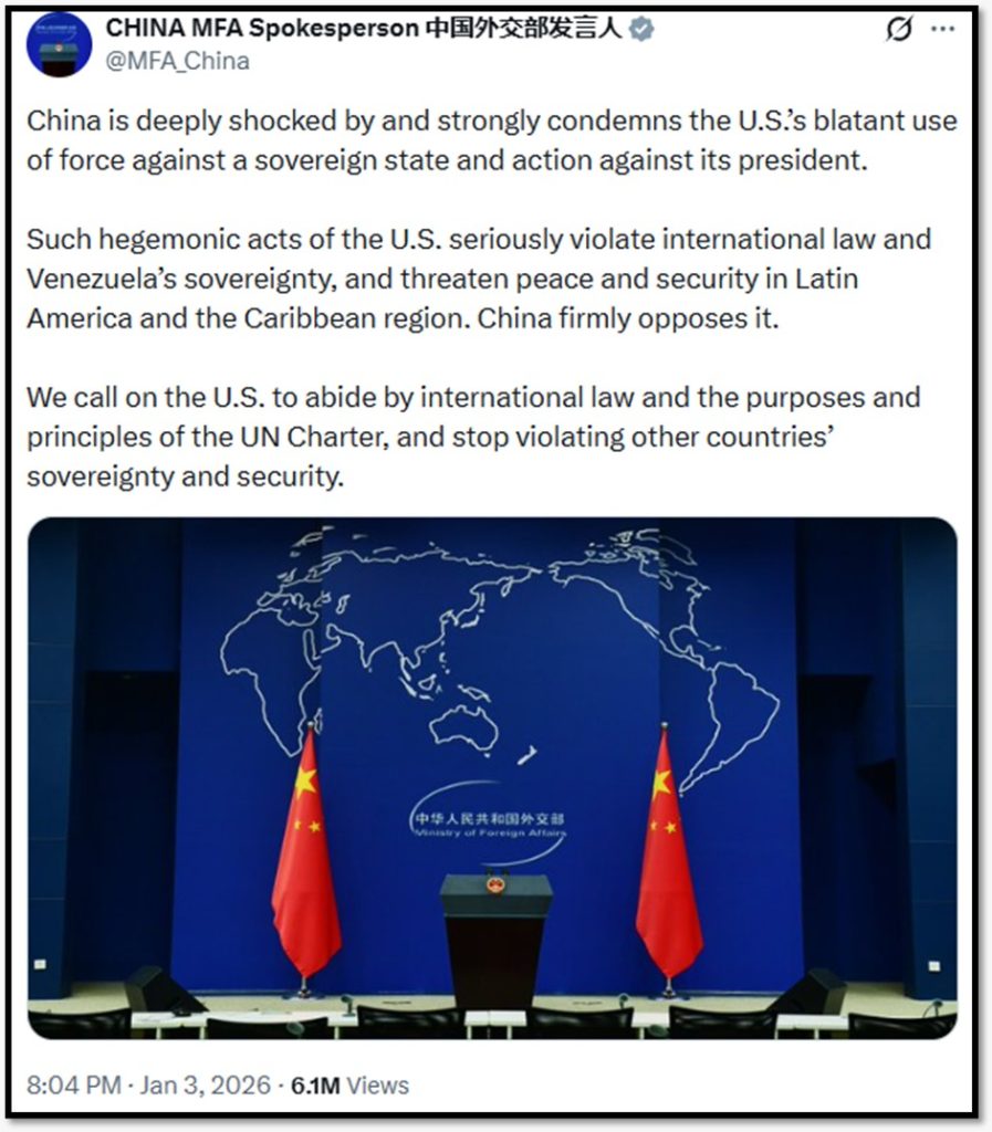 चीनी विदेश मंत्रालय ने अपने आधिकारिक बयान में अमेरिका की इस कार्रवाई को “बल का उच्छृंखल उपयोग” बताया और कहा कि यह लैटिन अमेरिका की शांति और सुरक्षा के लिए गंभीर खतरा है। चीन ने इसे अंतरराष्ट्रीय कानून और वेनेजुएला की संप्रभुता का उल्लंघन बताते हुए कड़ी निंदा की है।