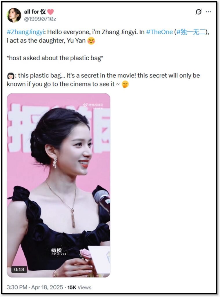 हालांकि बाद में खुद Zhang Jingyi ने इस पूरे मामले की सच्चाई बताई। उन्होंने स्पष्ट किया कि वह बैग कोई महंगा फैशन आइटम नहीं था, बल्कि उनकी फिल्म The One का एक प्रॉप (सामग्री) था।